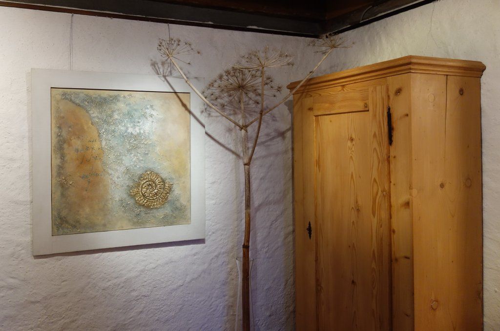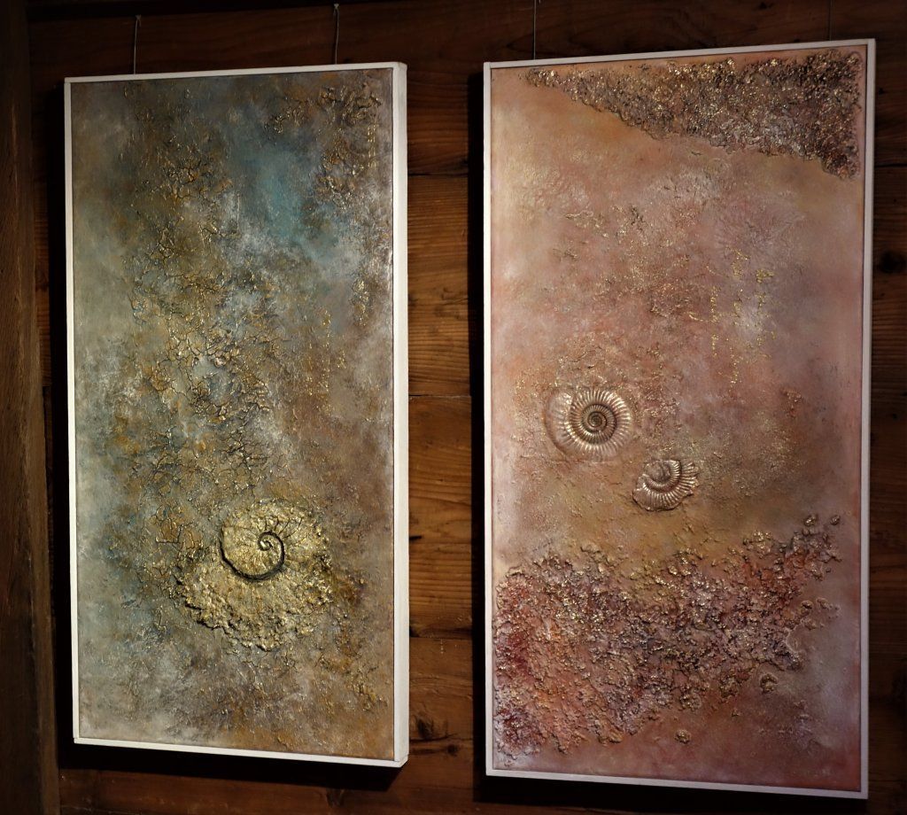 ...warme Farben in braunorangen und erdigen Tönen und ein plastischer Ammonit, mit feinem Goldhauch überzogen, liegt wie selbstvergessen in diesem warmen Untergrund. Harmonie, Geborgenheit, Wärme, Ruhe, Gelassenheit - damit kann man die Ausstellung von Susanne Zweifels grossflächigen Acrylbildern auf Leinwand umschreiben. Ihre Bilder haben nichts Flaches. Lebendige Strukturen modellieren sich um ihr Thema, bringen Natürlichkeit zum Tragen.